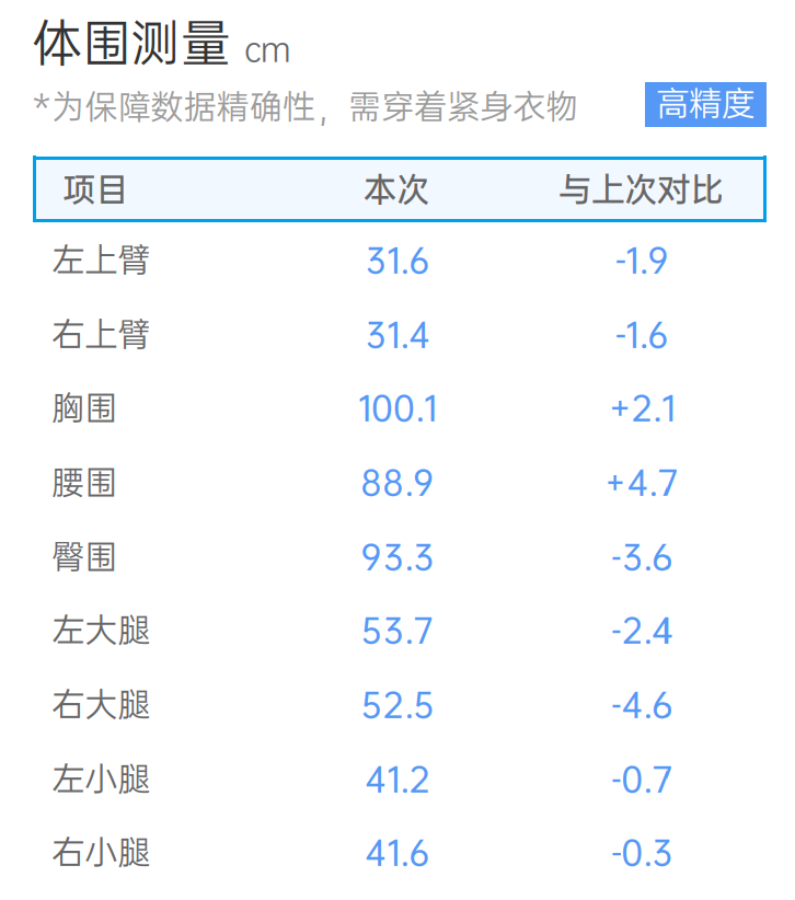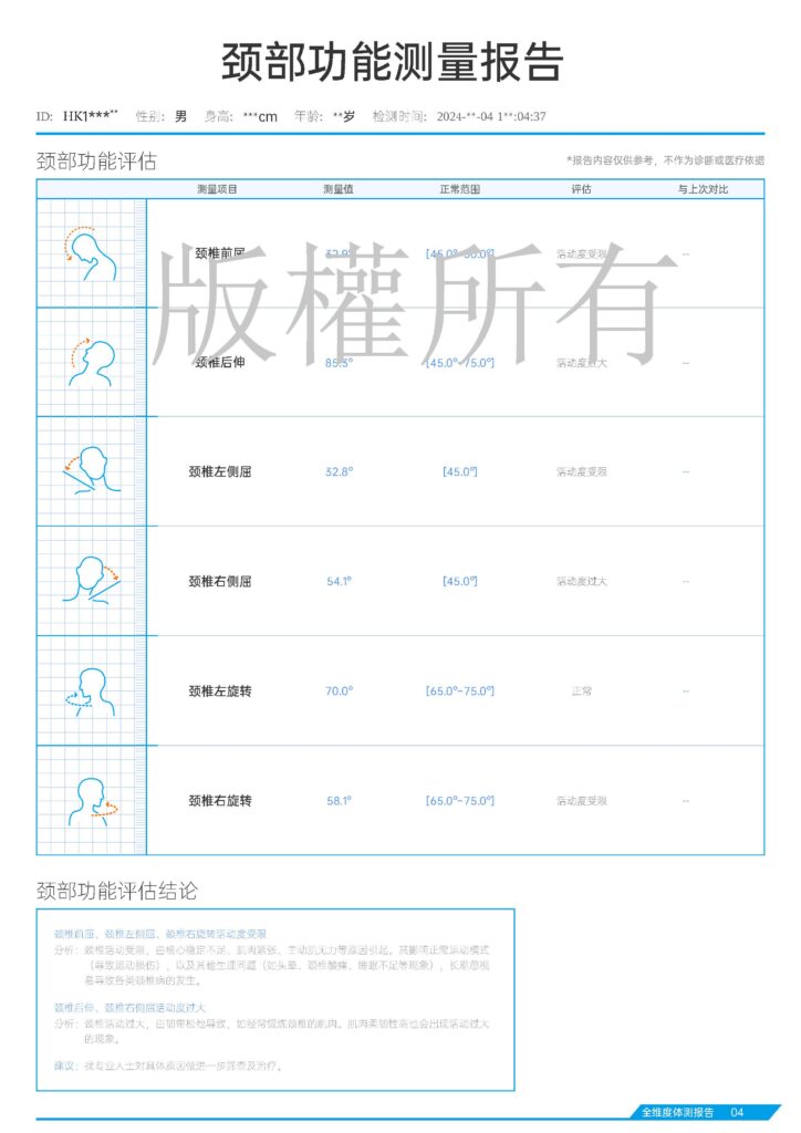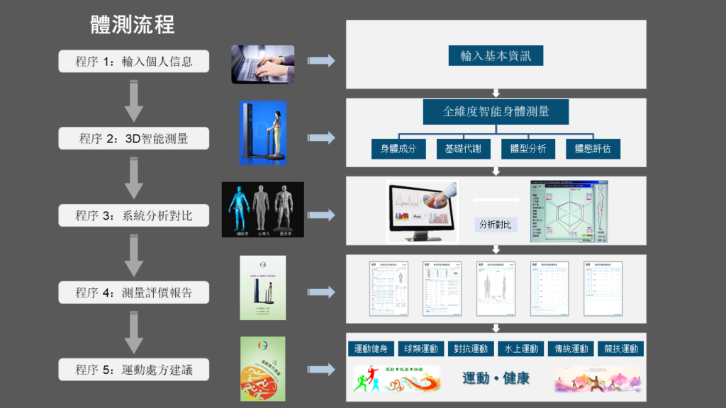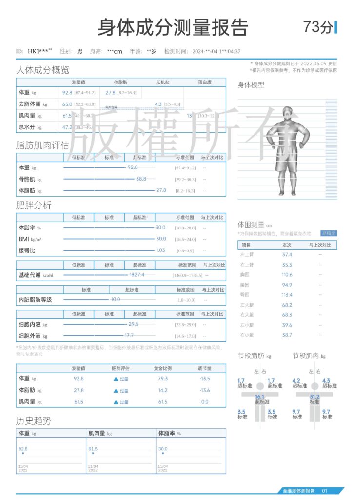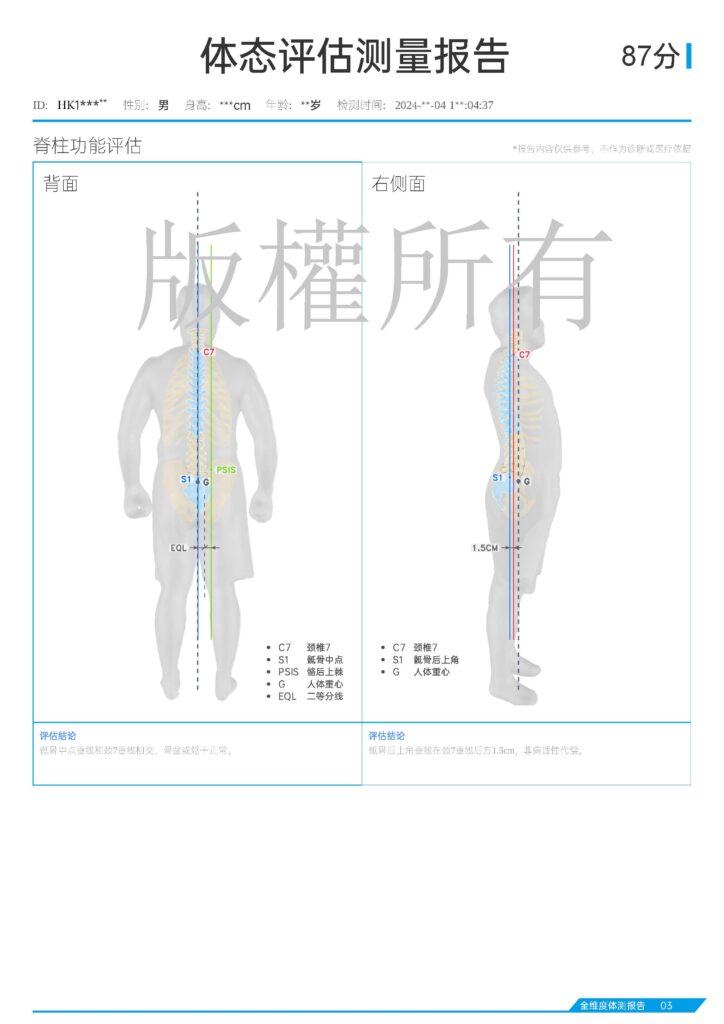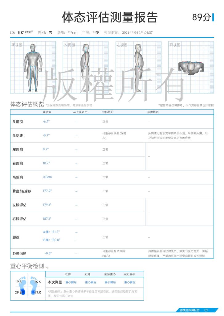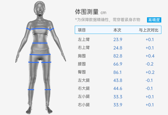 智能體測報告,肥胖数据一清二楚 身體 3D 圖示,高矮肥瘦一覽無遺 點擊進入查詢 · 預約 智能體測報告 精確報告,了解自己身體的體型、體態、機能狀況 運動處方建議 運動處方建議,科學的鍛煉方法,讓你從運動中受益 準確顯示、身體數據 全面反映、體型變化 直觀呈現、體態隱患 全維度智能測量 精准測量胸圍、腰圍、臀圍、大腿圍、小腿圍和上臂圍14項核心身體成分分析 9項毫米級體圍自動測量10項專業級體態評估 4象限重心平衡檢測6項頸部功能評估 4項肩部功能評估 你最想知道身體部位的大小,瞬間呈現! 高精度·數據準確 通過包含高精度的專業體成分分析、體態評估以及身體圍度測量等在內的全維度3D體測,獲得全面的身體數據資料,便於定制個性化練習計劃,或進行針對強化。 直觀對比不同階段的運動效果和體型變化 正常、肥胖、瘦弱對比 體測報告對同一測量者每次測量的歷史資料進行比對、分析、處理,讓您清楚(周、月、年)不同時間段的身體數值變化,了解參加運動、健身前後的效果,制定更有效的運動鍛煉計劃和達成目標。 太肥?太瘦?正常? 實時對比,一目了然 篩查隱患,及早發現問題 三維骨骼點檢測,完成身體傾斜、膝關節、X型腿、O型腿、骨盆前/後移等10項體型、體態評估,直觀呈現用戶隱藏的體態問題。360° 無光量光學掃描身體,不會對人體產生任何傷害,準確掃描身體位置偏差。之處 體型缺陷畸形?及早干預,改善隱患問題 頸、肩、脊柱功能評估 人體三維模型與全新Visens視覺感測器結合,快速採集骨骼資料並真實呈現,站立式測量反映人體自然狀態下肩頸、脊柱情況。根據頸部、肩部、脊柱的活動幅度,智能評估潛在的肩頸問題,及早預防中老年因肩關節功能退化、50肩等隱患造成的持續損傷。 數據顯示因看手機造成的頸椎,肩膊退化問題 身體成分與重心平衡分析 採用BDA及BIA融合演算法,身體成分檢測:細胞內外液等參數,比傳統體測儀單一電阻抗法資料更精准穩定、參考價值更高。高精度感測器檢測足底壓力級身體重心分佈情況,全面分析體態問題成因。 預測老人的平衡感知能力,預防老人摔跌 360° 身體體型預測 AI視覺與光學三維重建技術,34秒快速採集人體資料並生成真實3D人體模型,完美還原體型細節。同時,依靠豐富的臨床資料和人體模型資料,3D體態測量儀智慧預測體型變化,直觀看到理想體型效果。 快速採集人體數據並生成真實3D人體模型 無輻射,非入侵,安全保障 採用先進技術,非接觸式光學掃描,無輻射,無光線刺激,非入侵測量,智慧語音提示,結合手勢識別與動態姿勢技術,測量過程安全舒適。 資料嚴格保密,確保您的隱私安全 運動處方建議 由體育博士與運動醫學專家組成的團隊,根據檢測者的年齡、性別、身體素質、運動功能狀況等資料,依靠人體運動科學,做出針對性的運動處方建議,包括適宜的運動項目、運動強度、每次運動的時間以及運動頻率,以及運動中的注意事項。 提供科學、有效的運動健身指導方案 常見問題 什麼是“智能體測”? “智能體測”是一項通過人工智能、人體大數據等技術,結合3D掃描和感測器,精確捕捉身體圍度、長度、寬度、體脂率、肌肉量等18項身體成分指標,10項體態評估和9項體圍數據,對體質、體能、健康指標或特定運動能力進行精準化檢測分析,並生成詳細數字和體型、體態3D圖型報告,是一項快速、安全的身體測量、評估系統。 “智能體測”對女性減脂、塑身有什麼作用? 精准定位身體成分,避免盲目減重量化脂肪與肌肉比例:通過體測明確體脂率、內臟脂肪等級、肌肉量等資料,區分“減脂”和“減重”,避免因過度節食導致肌肉流失。識別易胖體質:分析基礎代謝率(BMR),瞭解自身每日熱量消耗能力,制定更科學的飲食計畫。針對性制定塑形方案局部脂肪分析:檢測腰臀比、四肢脂肪分佈,幫助針對腰腹、大腿等頑固部位設計訓練(如HIIT、核心訓練)。肌肉均衡評估:檢測左右側肌力差異,避免因力量不平衡影響體態(如骨盆前傾、圓肩)。動態追蹤效果,及時調整計畫監控減脂進度:定期體測可對比體脂率下降趨勢,而非僅關注體重數字(例如:體重不變但體脂率降低,說明增肌減脂成功)。預警期:通過代謝率變化資料,發現減肥停滯原因(如代謝適應),調整飲食或運動強度。提供個性化飲食與運動建議熱量計算:根據代謝資料推薦每日攝入熱量,避免過度節食或無效運動。運動類型匹配:結合體測結果推薦有氧(減脂)與無氧(塑形)運動比例(例如:體脂率高者需增加有氧,肌肉量低者需加強抗阻訓練)。預防減肥誤區,保障健康避免過度減脂:設定健康體脂率範圍(女性正常體脂率約21%24%),防止因追求“過低體脂”引發內分泌失調。 6. 營養缺乏提示:通過資料推測是否缺乏蛋白質、水分等,指導科學補充營養。 總體而言:“智能體測”幫助女性了解自己身體基礎狀況是否正常?一眼看清!體型、體態與正常人相比較,是否標準?過肥?過瘦?一目了然!根據報告的真實3D圖示,幫助女性清楚知道自己身體的狀況,根據“智能體測報告”和“運動處方建議”,針對性加強運動鍛煉,增加減脂的可能性。 如何做“智能體測”?需要多長時間? 事前查看網站鏈接的智能體測視頻,了解智能體測的程序和要求。穿著緊身服裝(如瑜伽服),或短褲、緊身背心,不要穿戴首飾。聽從工作人員安排,在體測儀平台按指示完